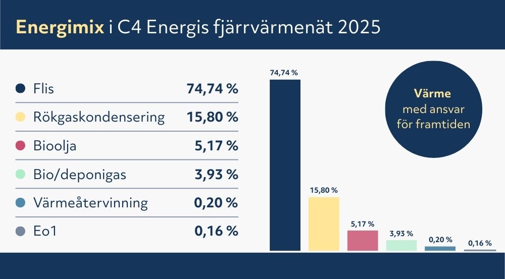 Vi producerar din fjärrvärme lokalt på Allöverket i Kristianstad. Det gör vi med olika typer av bränslen som tillsammans kallas för energimixen. När du värmer ditt hem med fjärrvärme från C4 Energi gör du miljön en tjänst - Vår energimix är över 99% fossilfri. Dessutom kommer de flesta av våra bränslen från närmiljön. Nedan redovisas ursprunget från våra biobränslen.